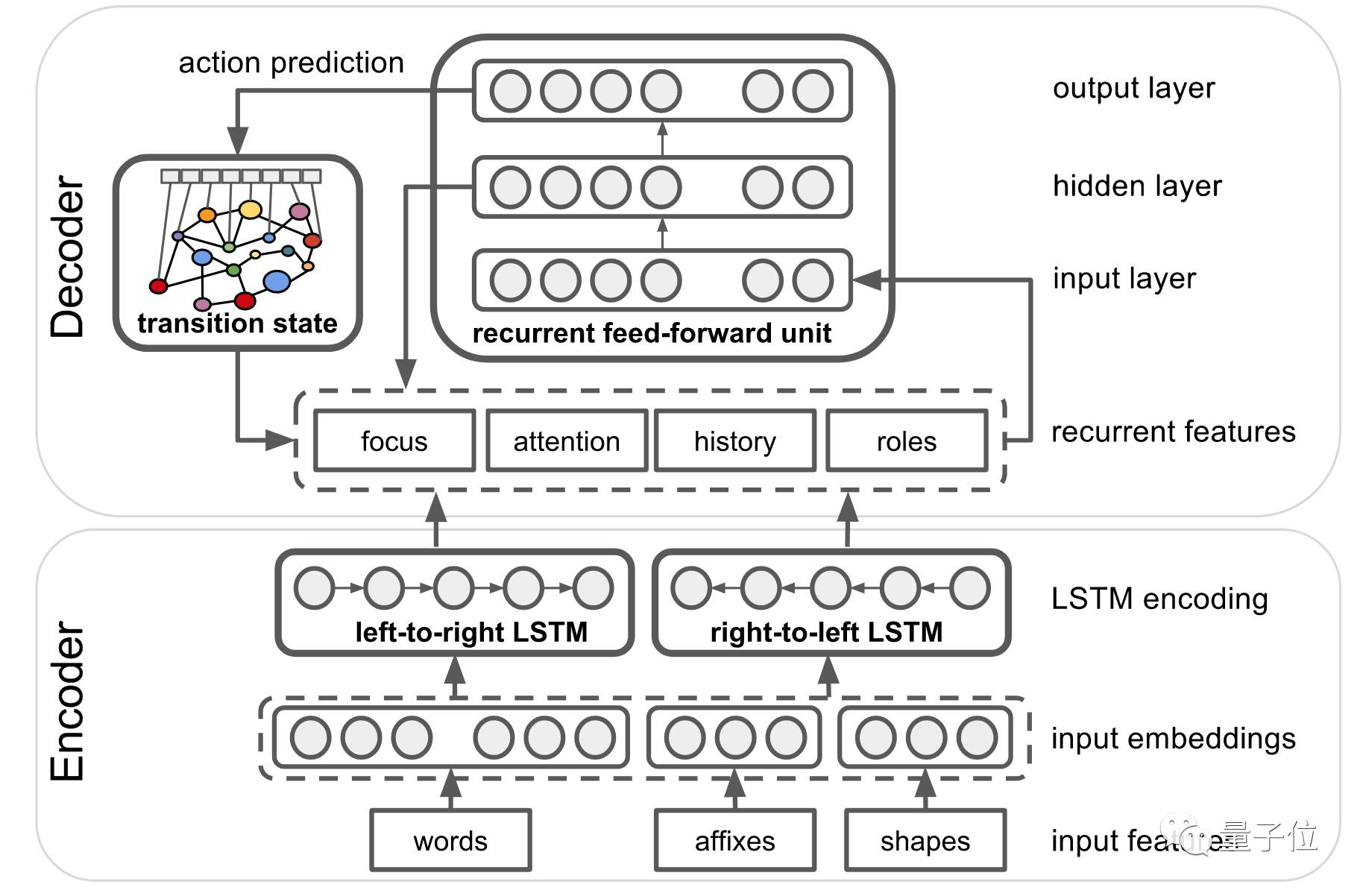 在内部,SLING使用编码器-解码器架构,其中使用诸如原始单词,其后缀,标点符号等简单词汇特征将每个输入词编码成向量。而解码器用这种表示和自己历史中的循环特征,来计算更新框架图示以获得输入句子的预期框架语义表示所需的转换序列。