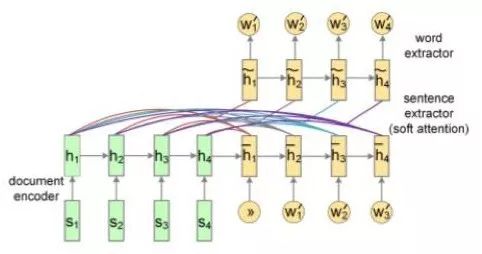以前大多数的extractive summarization 都是基于人工特征来完成的,而在ACL2016上,Cheng[2]等发表的Neural Summarization by Extracting Sentences and Words针对extractive summarization任务提出了data-driven的方法,在该论文中的模型分为了如图3所示的sentence level以及如图4所示的word level两个粒度。其中sentence level把问题看做了一个序列标签问题,每个句子分别标记上提取或者不提取。而对于word level问题,作者认为其是介于abstractive summarization和extractive summarization之间的一个生成问题,而生成的词局限于原文档中出现的词。本文将介绍word level这个模型。