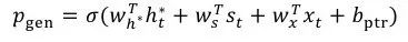 是Ptr-Net在做完softmax归一化后的结果。而 pgen 则是一个比例系数。这个系数这样计算得到: