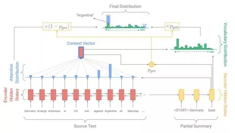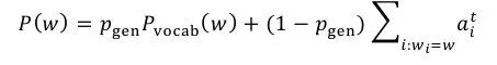 是一个在词语上的概率分布。所以和普通的Ptr-Net不同的是,普通的Ptr-Net指针指向的是encoder输入中的一个位置,把该位置的输入拷贝到decoder来,而这个模型中,最后作为decoder输入的是一个词语概率分布。