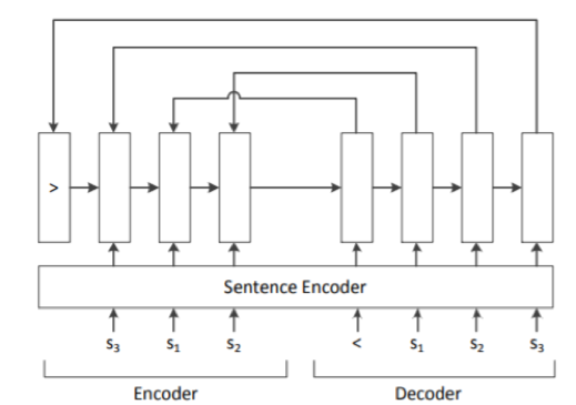 句子排序任务是把一系列的句子调整为连贯、可读性强的文本,是自然语言处理领域中十分重要而又困难的工作。一段好的文档是有很高的逻辑性和主题结构的,因而在许多任务当中都需要用到句子排序。L Logeswaran[5]和J Gong[6]等人,则提出了基于Ptr-Net的句子排序任务。如图7所示,模型的输入是若干句子 s=s1,…,sn,对于训练对(s,o),我们可以得到: