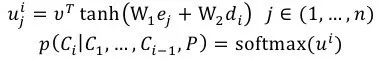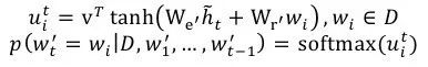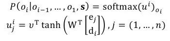 其中向量 ui 在经过 softmax 规范化后得到的概率分布便是基于输入内容的输出预测分布。公式中的v, W1, W2 都是可学习的参数。在这个过程中,我们直接使用得到的softmax结果去拷贝encoder对应的输入元素作为的decoder输入的向量。