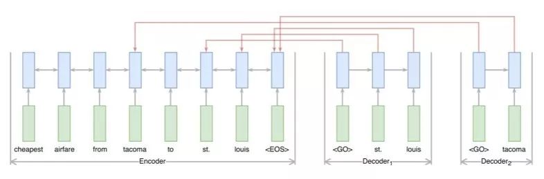 大部分结果显著的信息抽取方法是依赖于token-level标签的,但是得到这些标签是费时费力的,并且这些标签作为一个中间步骤,并不是任务期望的输出结果。因而在2017年,RB Palm[4]等人提出了End-to-End的信息抽取方法,该方法基于Ptr-Net的思想,在没有使用token-level标签的情况下便得到了非常有竞争力的结果。如图6所示,该模型的输入是N个词语x = x1,…,xN,模型中使用了一个共享的encoder,但是decoder则是有多个的,每一个decoder对应一个需要被抽取得到的信息。用k=1,…,K 表示decoder的序号。在每一步j,每一个decoder都需要计算出一个,即softmax归一化前的attention分数。
