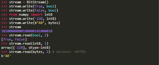 Bitsteam内置对标准二进制输出的常用数据类型的支持:布尔值、字节、固定宽度的整型,浮点整型。