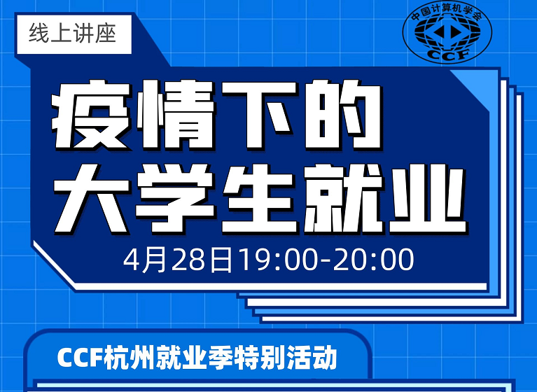 4月28日晚上19:00,由CCF杭州和CCF YOCSEF杭州发起就业季特别活动——疫情下的大学生就业。B站搜索“CCF会员服务”即可观看直播。