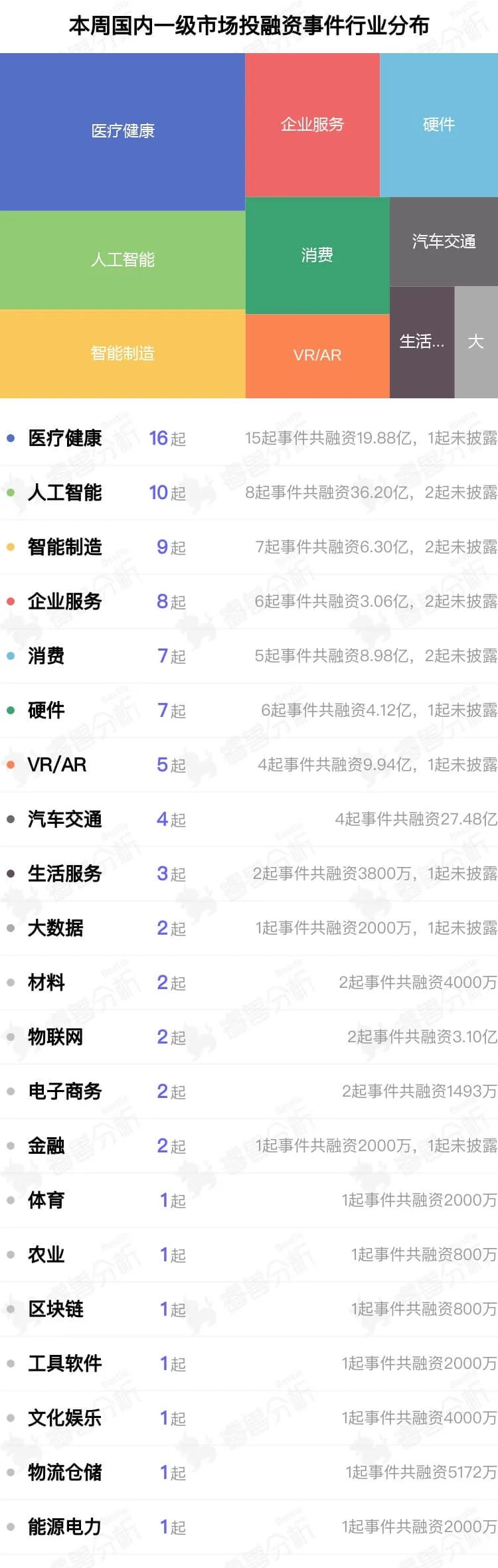 本周医疗健康、人工智能、智能制造领域融资最活跃