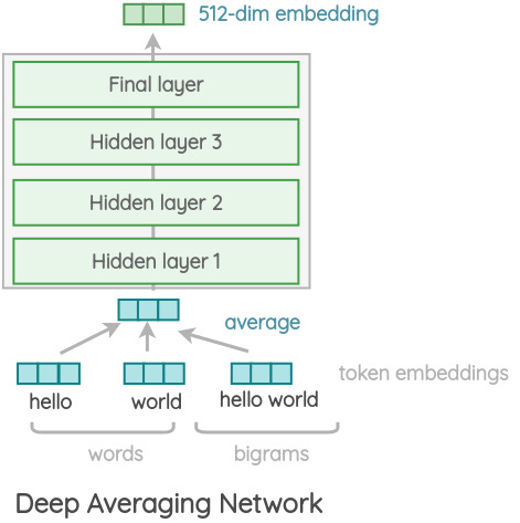 在这个更简单的变体中,编码器基于Iyyer等人提出的架构。首先,将一个句子中单词的嵌入和bi-grams平均在一起。然后通过4层前馈深度DNN,得到512维句子嵌入输出。单词和bi-grams的嵌入是在训练中学习的。