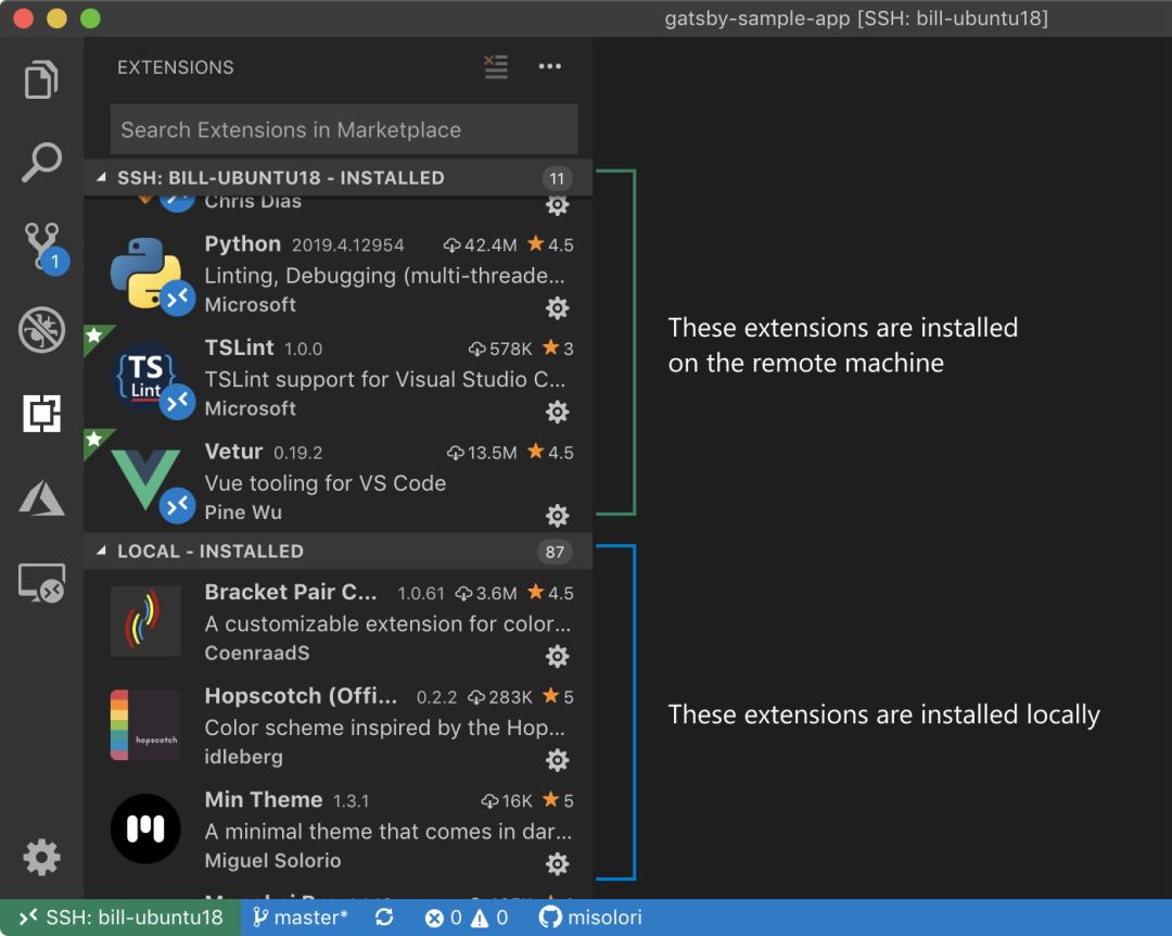 工作区扩展是远程安装的。它们访问工作区中需要编辑的文件和文件夹,以提供智能感知(完成)、GoTo定义、调试等等。这些扩展可以自定义UI。它们是远程运行的,因此它们可以完全访问远程主机上的文件系统和工具。