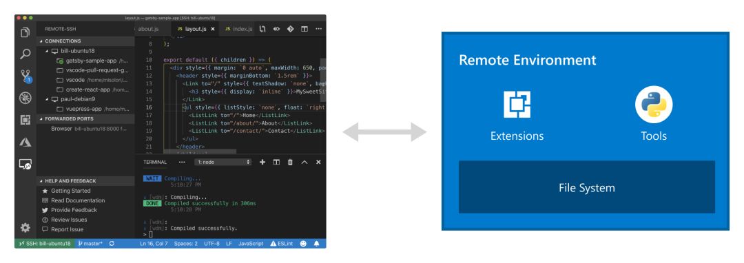 可以确信的是,我们需要的是同时在两个地方运行VS Code的方法,在本地运行开发工具,并连接到一组在物理或虚拟机(例如,容器或虚拟机)上下文中远程运行的开发服务。这将在远程环境中为你提供丰富的本地开发经验。
