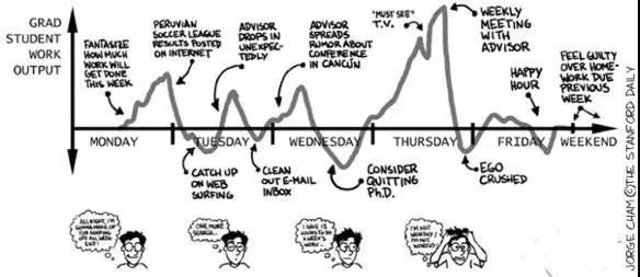 很多朋友会有类似的“拖延症”的经历:到了实验室什么都不想做,不停地看网页,看手机,甚至去读paper,写计划,也不去做那些最重要的事情, 比如做那个最关键的实验,或者是完成数据分析并做图等等。这样一天天过去,自己越来越焦虑,越来越stressed out /depressed。心理学中有一个现象叫做Zeigarnik effect,说的是相比于已经完成了的任务,人们会更好地记住未完成的任务。在现实生活中,在自己故意拖延避开做一些很重要的事情的时候,大脑就会潜意识的花很多的能量就注意那“些未完成任务”,让自己越来越焦虑。这就是为什么我们划掉to do list 上面的任务的时候会有很大的释然的快感,在一天结束最累的时候不是那天做了很多工作,而是一天什么事情都没做完。
