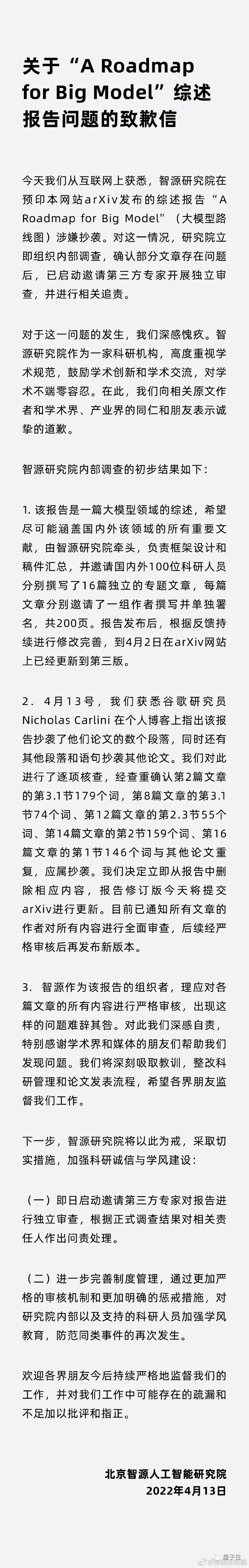 按初步调查结果,智源决定立即从文章中删除已确认的抄袭内容,并通知所有作者对所有内容进行全面审查。