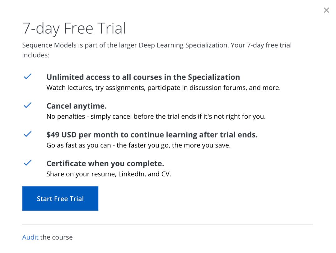 如果你只想看视频,可以选择用Audit模式旁听课程,免费,但是不能做作业(编程练习),也不能完成小测验。
