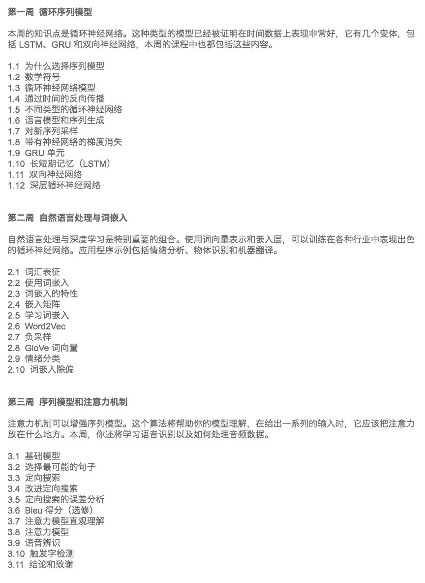 有了第五课“Sequence Models”里面关于NLP的内容,吴恩达终于把深度学习系列的内容拼全了。从深度学习入门,到计算机视觉,再到自然语言处理,吴恩达的课程无疑为想入行人工智能的小伙伴们提供了极佳的入口。