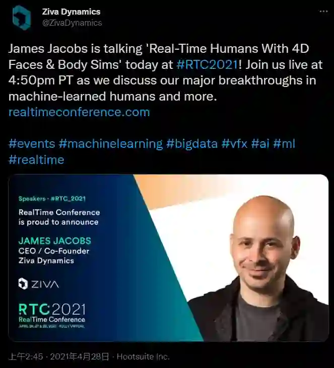 2021年4月28日,James Jacobs在RTC2021演讲分享:「实时人类与4D脸和身体模拟」,探讨机器学习人类的技术进展。