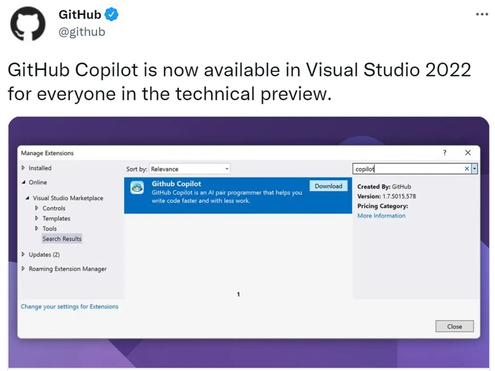 在收到来自 GitHub 的电子邮件后,证明你有访问权限,就可以进入 Visual Studio 2022 ,在 Extensions > Manage Extensions 中搜索 GitHub Copilot。