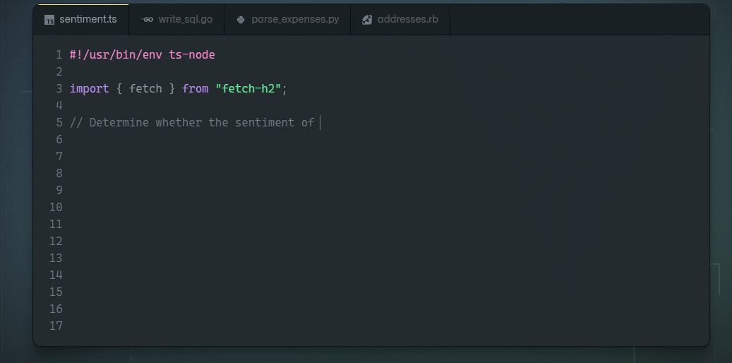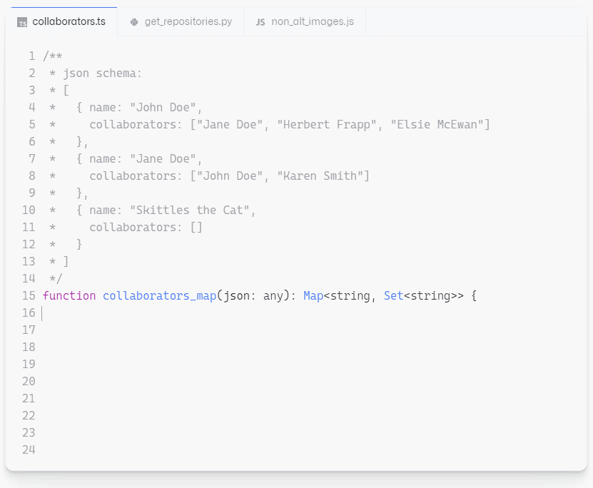 先来看一下 Copilot 的主要功能——代码补全的效果。以 TypeScript 语言为例,给出函数名和参数,Copilot 就能自动补全代码。