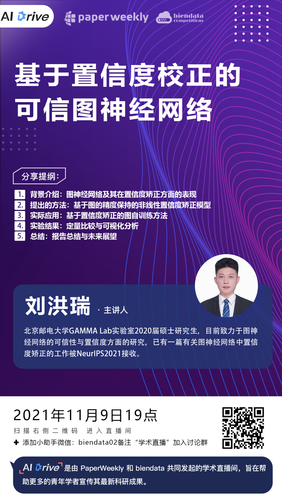 本期 AI Drive,我们邀请到北京邮电大学 GAMMA Lab 实验室刘洪瑞 ,为大家在线解读其发表在 NeurIPS 2021 的最新研究成果:Be Confident! Towards Trustworthy Graph Neural Networks via Confidence Calibration。对本期主题感兴趣的小伙伴,11 月 9 日(本周二)晚 7 点,我们准时相约 PaperWeekly 直播间。