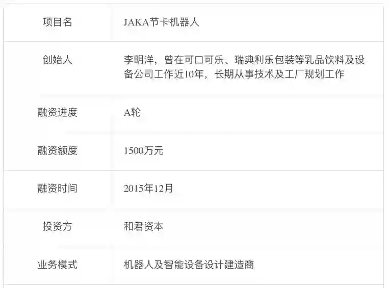 目前,“节卡机器人”已搭建智能装备、工厂数字化、机器人三个业务板块,拥有蒙牛、旺旺、光明、新乡化纤等16家客户,今年预计营收1.2亿元。公司计划在今年底或明年初完成B轮融资。
