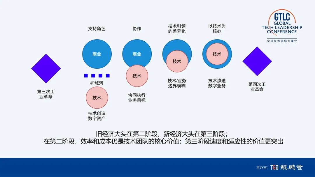 我们技术和业务的结合分为几个阶段,第一阶段是神秘主义,技术和商业中似乎有一道护城河,中国现在已经跨过了这个阶段;第二阶段是协作,其实就是卷王时代的特点,技术按需求工作,协同执行业务目标;第三阶段是技术引领的差异化,技术和业务边界模糊,强调的是技术怎样使业务快速试错。因为技术内核已经确定,在哪个场景能把内核的价值放大,是需要快速试错的;第四阶段是技术同学的梦想,就是代码主宰一切,可能是将来元宇宙带来的时代。