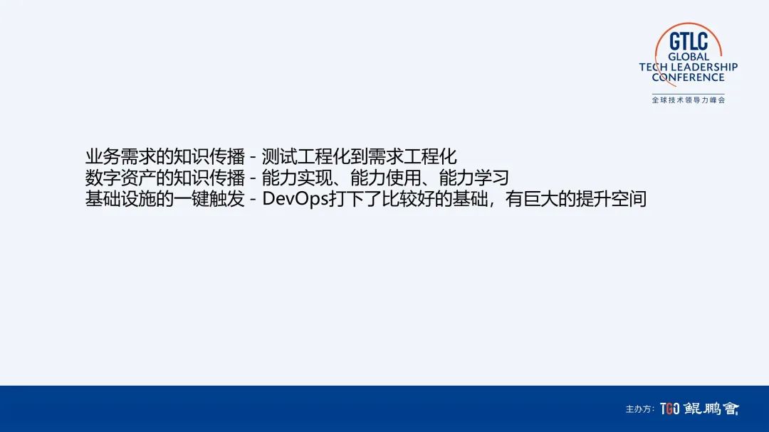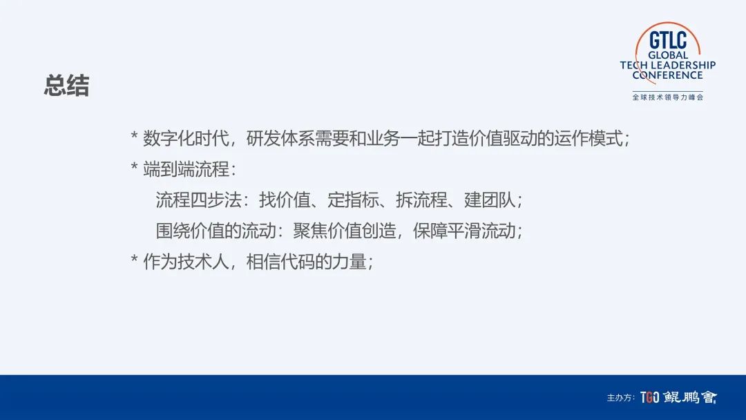 数字化时代研发体系要打造价值驱动,其中最主要的是端到端流程的闭环。拆解开主要是两大目标,一是围绕价值的工作,二是要让工作流动起来。最后一定要相信代码的力量,特别是代码驱动数字化世界。XasCode 是我自己追求的大方向,但目前还是碎片化的,期待有更多同学一起打造一个端到端闭环的 XasCode,谢谢大家!