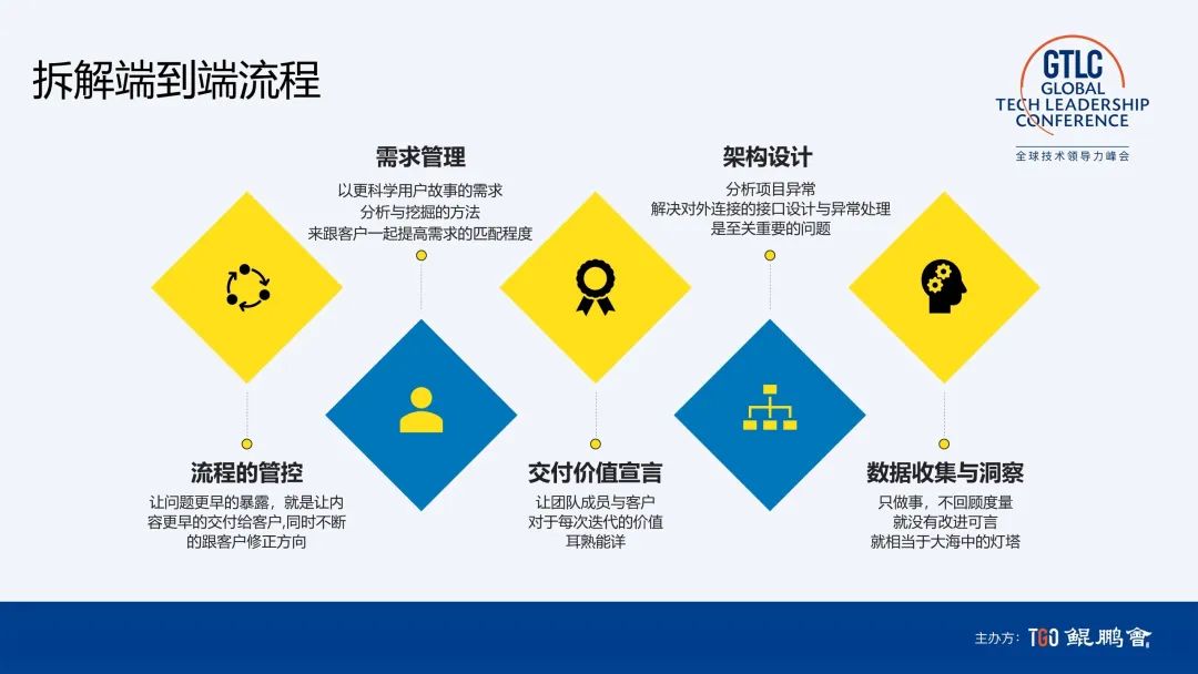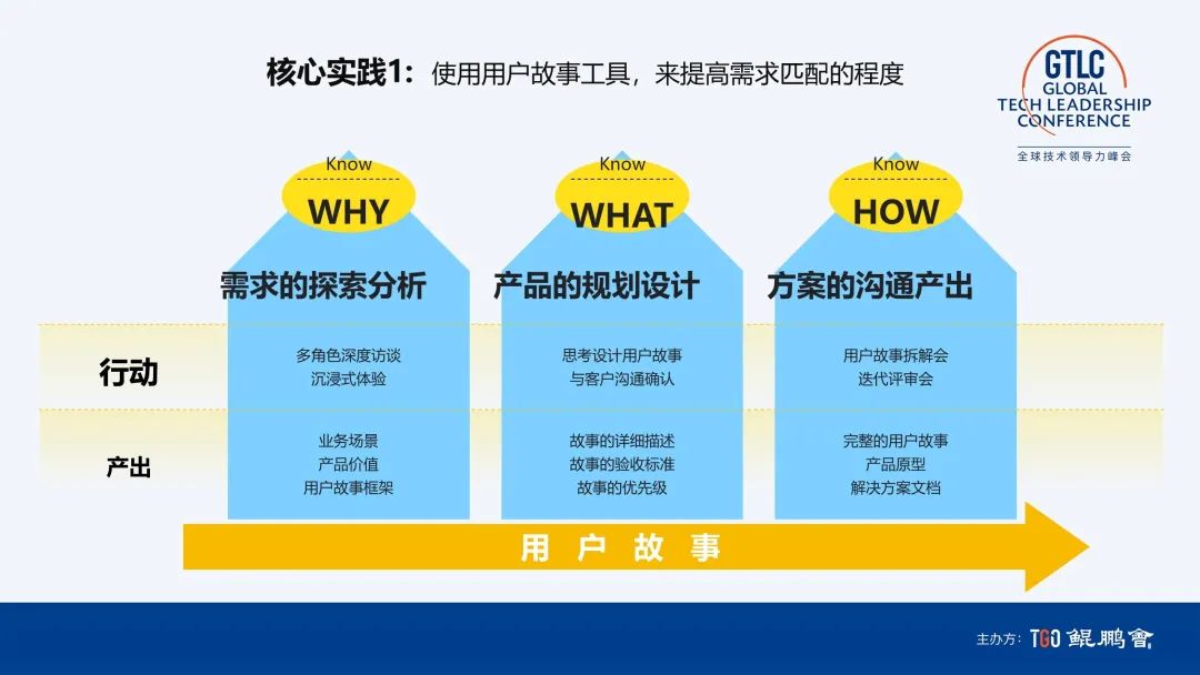 首先,使用用户故事工具,来提高需求匹配的程度,把讲故事作为整个团队工作的核心。只有跟客户一起讲故事,才能围绕价值创造推进项目。用户故事最有价值的地方是建立一公里宽,还能做到一公里深。我们以前的需求是全,能做到一公里宽,但只有一厘米深。用户故事很简单,难的是端到端都相信用故事来驱动工作。我们说服研发团队围绕用户故事做构建,按照用户故事的颗粒度来定义 Future,我们把它定义一个新的概念叫用户故事集,这是对团队心智的挑战。最难的挑战是围绕用户故事做交付。我们一个项目两个月做交付,会两周做一次客户业务部门参与的 Demo 日,真正落实的程度非常高。全流程端到端做用户故事是最重要的实践价值。
