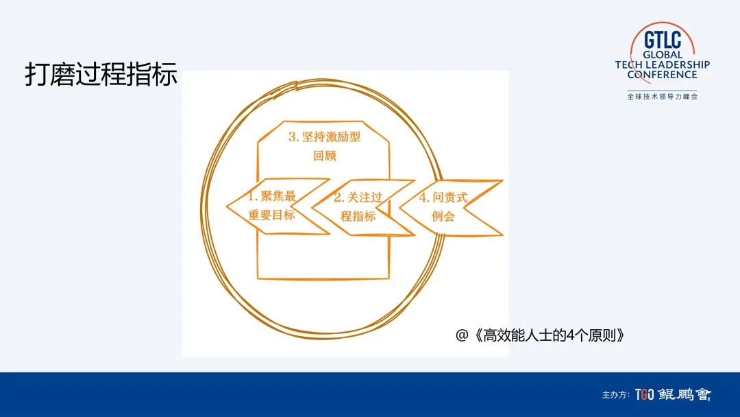 指标体系的定义方式它包含 OE 和 KOL。我们把指标拆成两步,一部分是结果性指标,就是刚才讲的内部指标和外部指标。第二部分是过程指标,一定要围绕结果指标拆解过程指标。过程指标是一个复杂体系,我自己带团队的一个最有效的拆过程指标的方式,也是一个四步法。