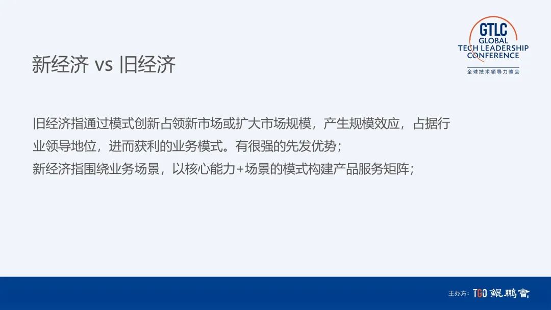 那么新经济和旧经济模式的主要差别是什么?旧经济指通过模式创新占领新市场或扩大市场规模,产生规模效应,占据行业领导地位,进而获利的业务模式。有很强的先发优势。新经济的特点是围绕业务场景,以核心能力 + 场景的模式构建产品服务矩阵。