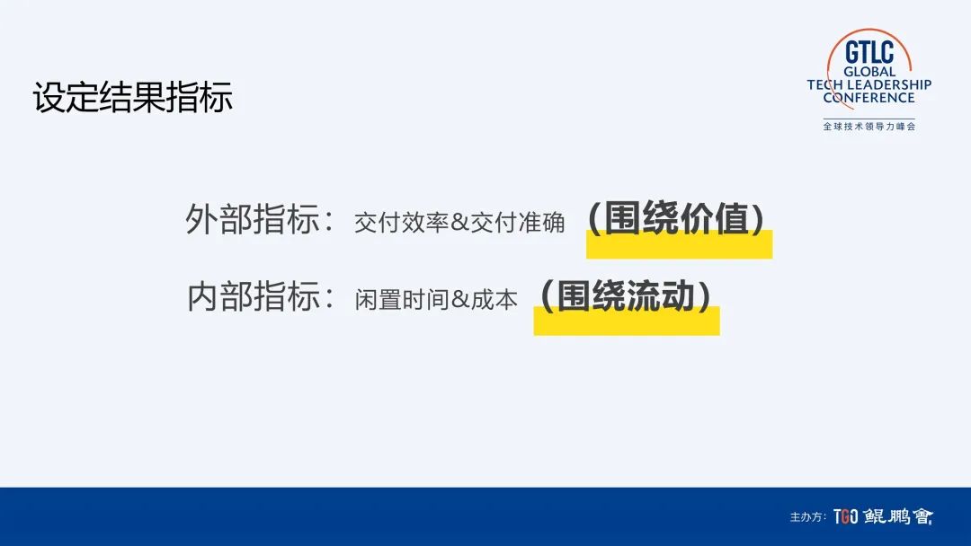端到端实践分为四个步骤:找价值、设指标、拆流程、建团队。这四个步骤的关键是顺序,因为一旦把团队放在前面,肯定会围绕团队定流程、设指标,就会很麻烦。首先是定义价值,通过用户故事,实现端到端的快速交付。会设定两个关键指标,有时候我们也会纠结定义外部指标还是内部指标为主,后面我们发现,“小孩子才做选择,成年人都要。”——外部指标和内部指标各定一个。外部指标定义的是交付效率和准确度,围绕价值部分,即能够为客户带来什么;内部指标关注闲置时间和成本,主要围绕流动的部分,因为一件事只有流动起来,才能从本质上提高效率。