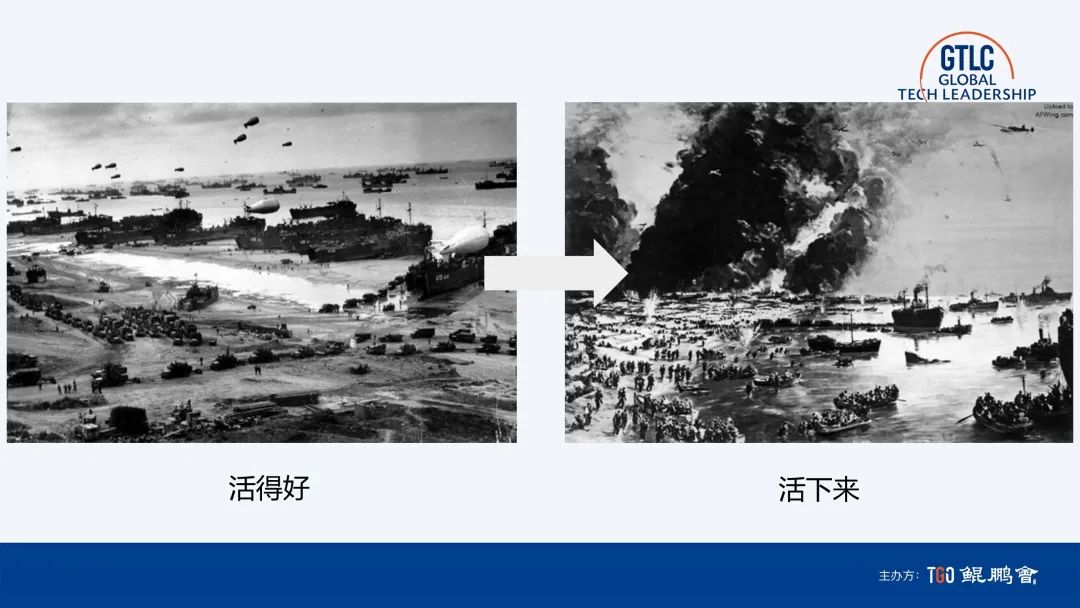 首先看经济。我默认大多数同学现在的企业都面临像我服务企业一样,正在经历生死考验,我们是亲身经历者。但前几年,大家的思维方式和现在大不相同,都在考虑我怎样做一件伟大的事。这两张图片大家都很熟悉,这两个看上去很像的场景,一个是诺曼底登陆,表示规模化,活得好;第二个是敦刻尔克,考虑的是有序撤退,这是很有意思的对比。