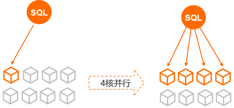 并行查询的加入使得PolarDB突破了单核执行性能的限制,利用多核CPU的并行处理能力,在PolarDB上部分SQL查询耗时成指数级下降。
