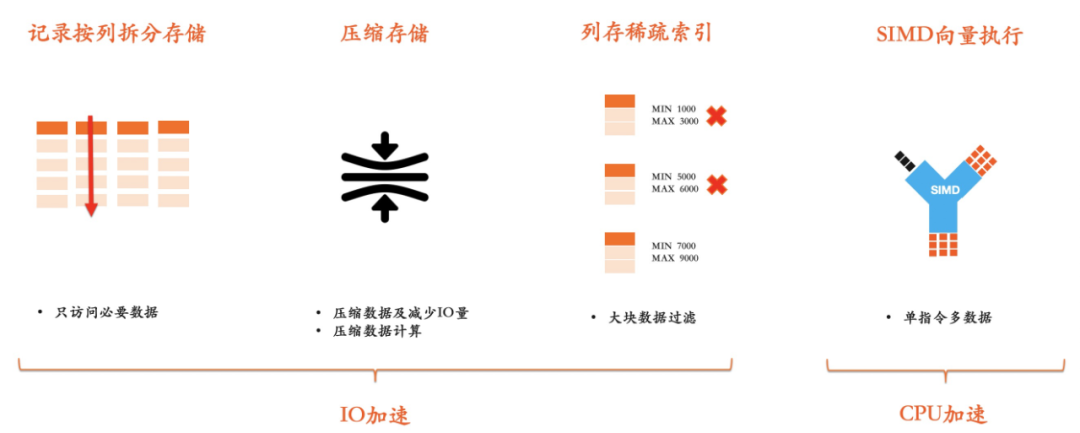 列式存储同样能提高CPU在处理数据时的执行效率,首先列存的紧凑排列方式可提升CPU访问内存效率,减少L1/L2 Cache miss导致的执行停顿。其次在列式存储上可以使用应用SIMD技术进一步提升单核吞吐能力,而这是现代高性能分析执行引擎的通用技术路线(Oracle/SQL Server/ClickHouse).