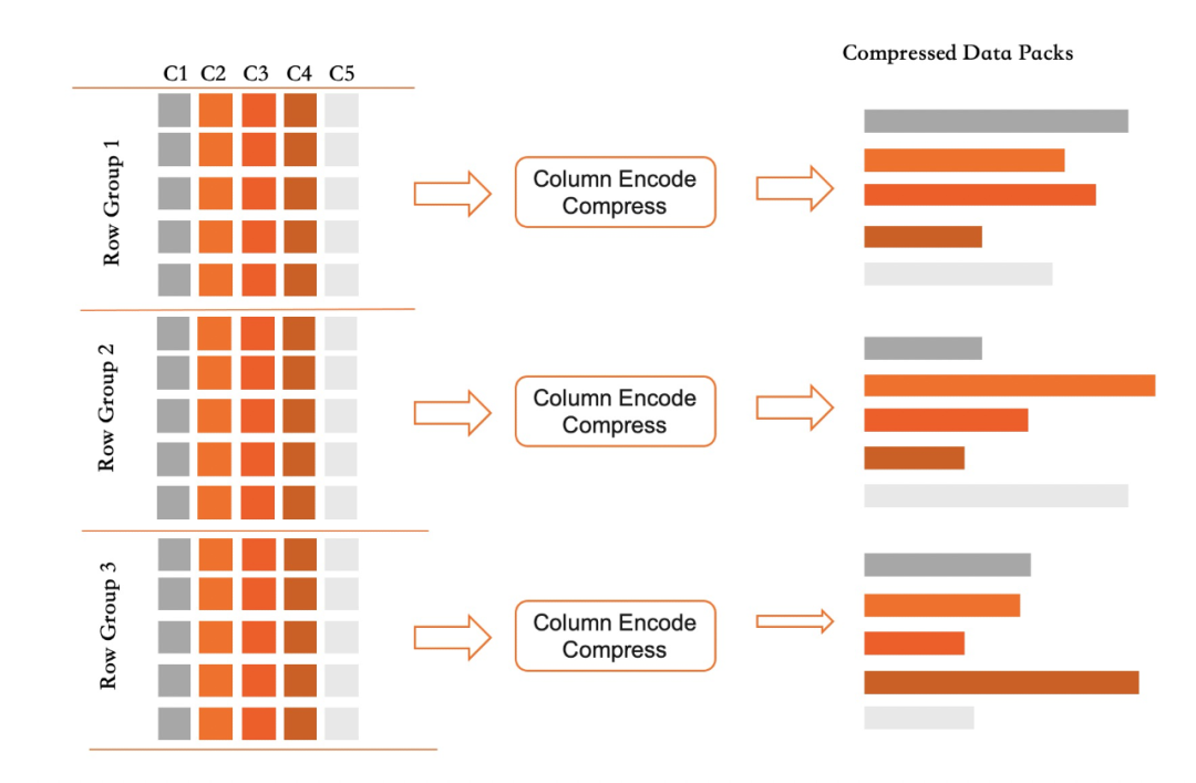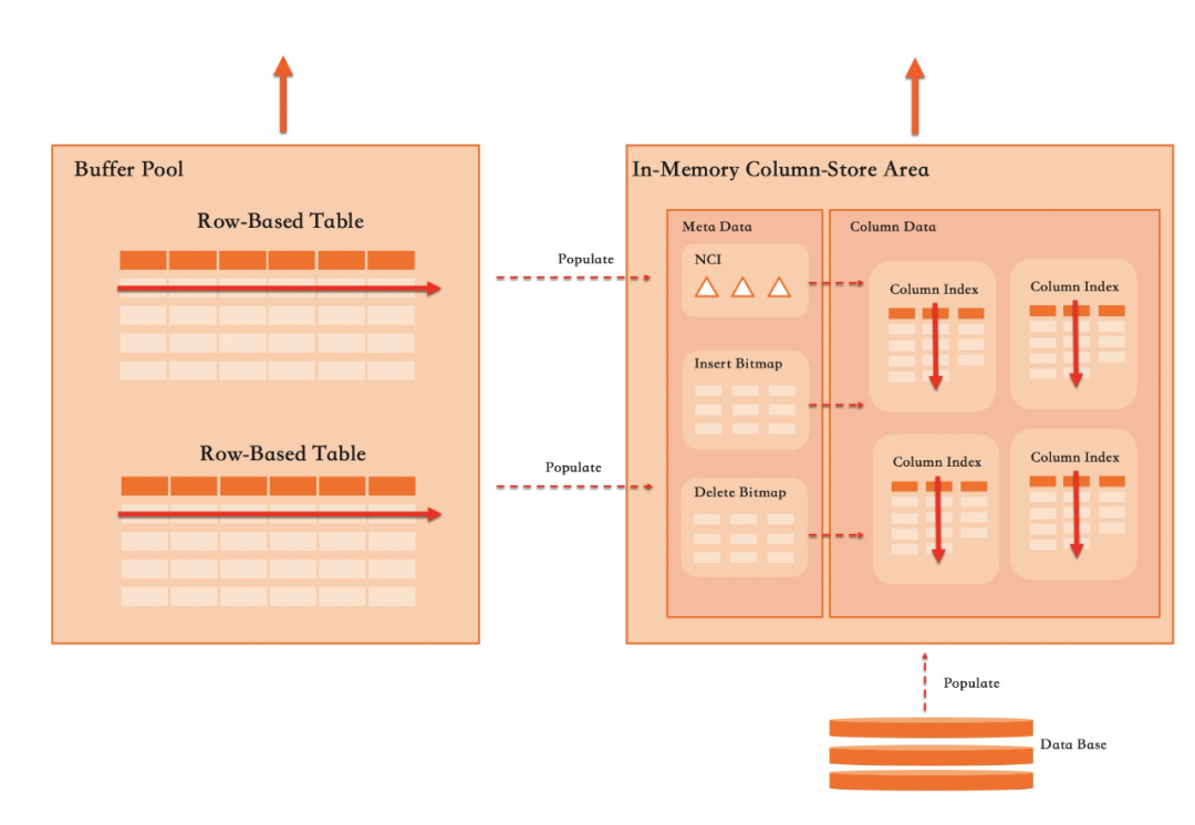 列存数据默认压缩格式存储在磁盘上,并可以使用In-Memory Columbia Store Area来做缓存加速并加速查询,传统的行格式依然保存在BufferPool中供OLTP性负载使用。