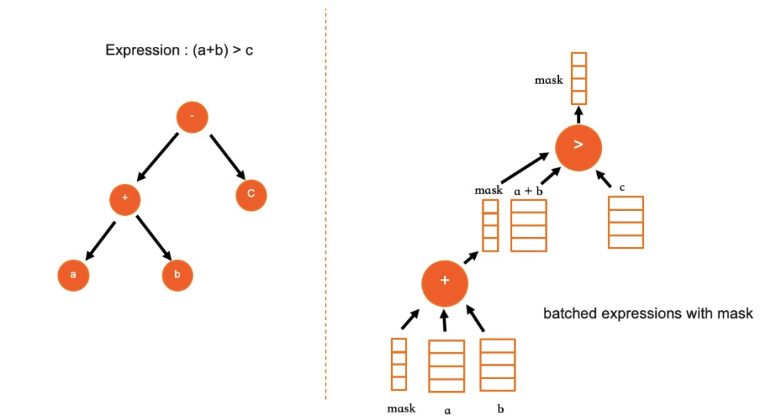 在列存格式下,由于每一列的数据都单独顺序存储,涉及到某一个特定列上的表达式计算过程都可以批量进行。对每一个计算表达式,其输入和输出都以Batch为单位,在Batch的处理模式下,计算过程可以使用SIMD指令进行加速。新表达式系统有两项关键优化: