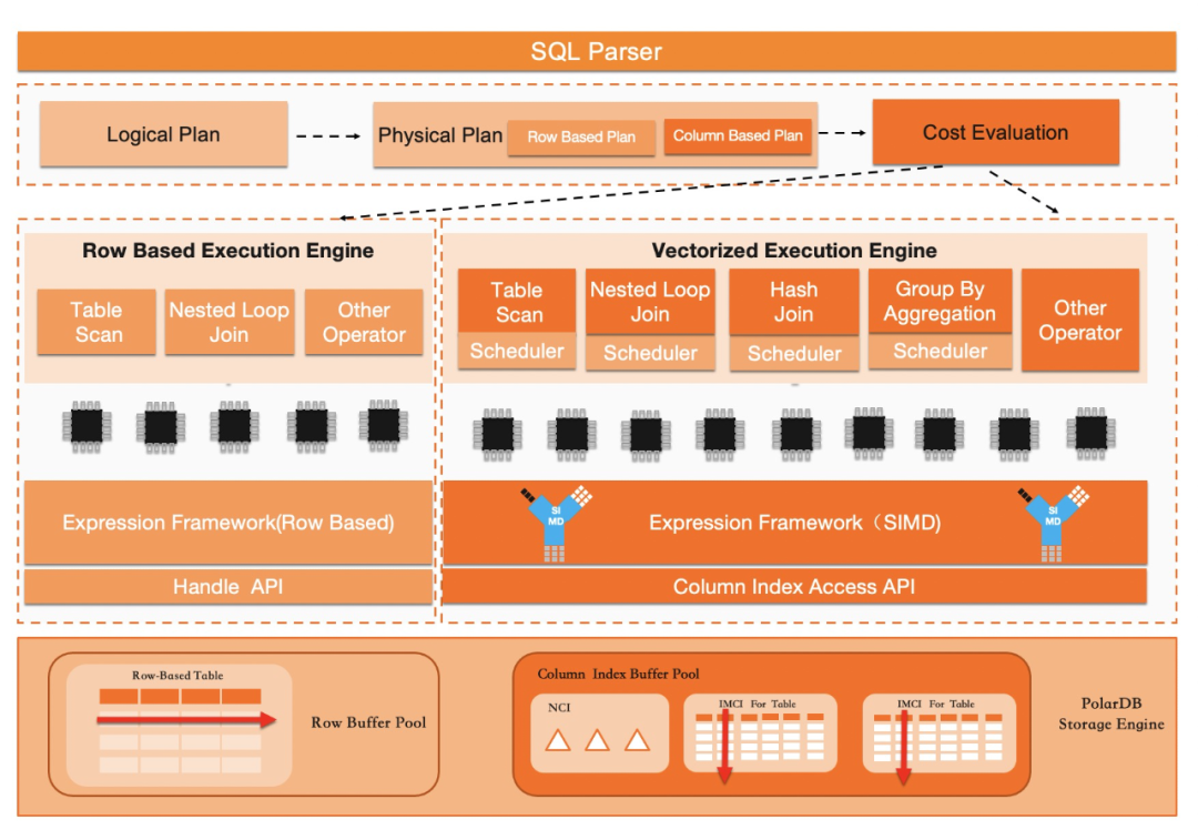 在PolarDB的SQL执行器层,我们重写了一套面向列存的执行器引擎框架(Column-oriented), 该执行器框架充分利用列式存储的优势,如以4096行的一个Batch为单位访问存储层的数据,使用SIMD指令提升CPU单核心处理数据的吞吐,所有关键算子均支持并行执行。在列式存储上,新的执行器对比MySQL原有的行存执行器性有几个数量级的性能提升。