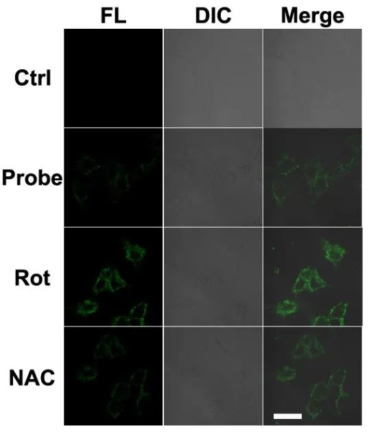 Fig 4. Confocal images of HeLa cells incubated with CBH for 30 min with pretreatment of Rot and NAC. Scale bar represents 20 μm.
