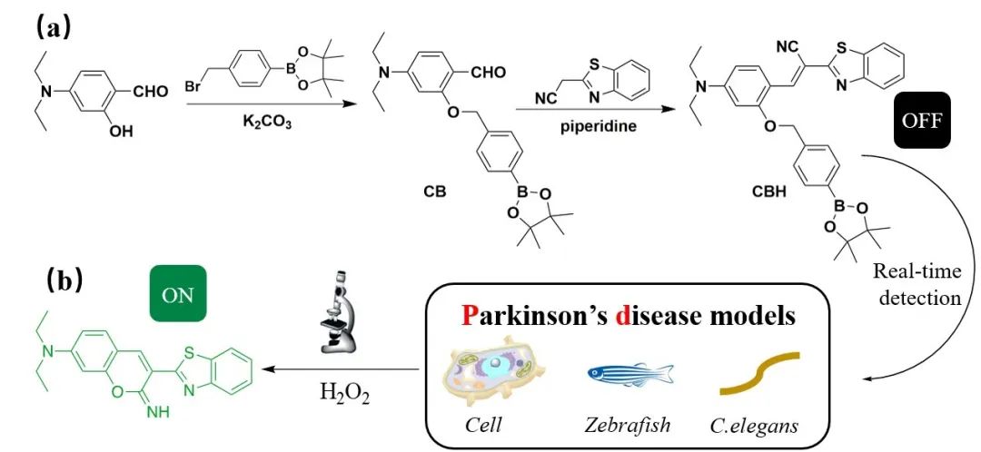 本文设计合成了具有高度选择性的荧光探针。利用与 H2O2 发生特异性氧化还原反应的苯硼酸酯作为反应基团,经简单的有机合成反应,得到发光很弱的荧光探针分子 CBH。探针 CBH 与 H2O2 发生特异性反应后,被氧化为酚,经消去和成环过程,转化为具有优异发光性能的荧光染料分子,通过荧光信号“开-关”实现对 H2O2 的检测。此探针可应用于细胞、斑马鱼和线虫 PD 模型中的 H2O2 成像,研究 H2O2 含量与PD的关系,达到检测疾病的目的。