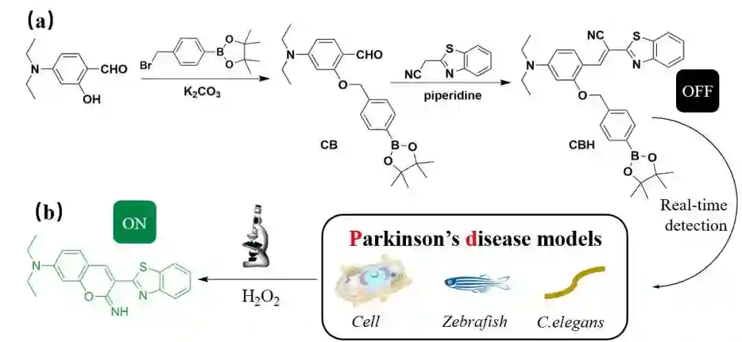 本文设计合成了一种新型 H2O2 荧光探针,具有高选择性和灵敏性,能够检测复杂生物体内如细胞、斑马鱼和线虫等 PD 模型中 H2O2 含量的变化,具备诊断早期帕金森病的潜在应用价值。