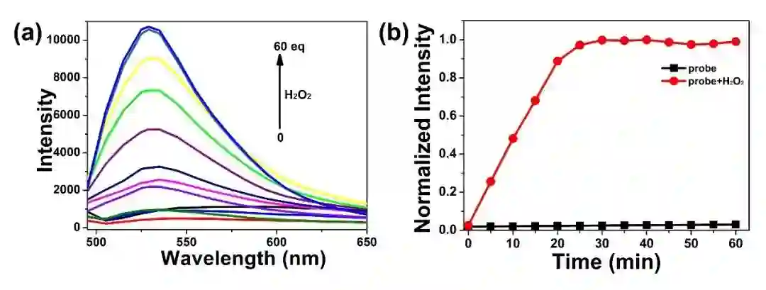 Fig 1. (a) Fluorescence spectra of CBH in PBS buffer solution in the presence of H2O2at different concentrations. (b) Time-dependent fluorescence intensity of CBH upon addition of 10 equiv. H2O2 in PBS buffer solution.