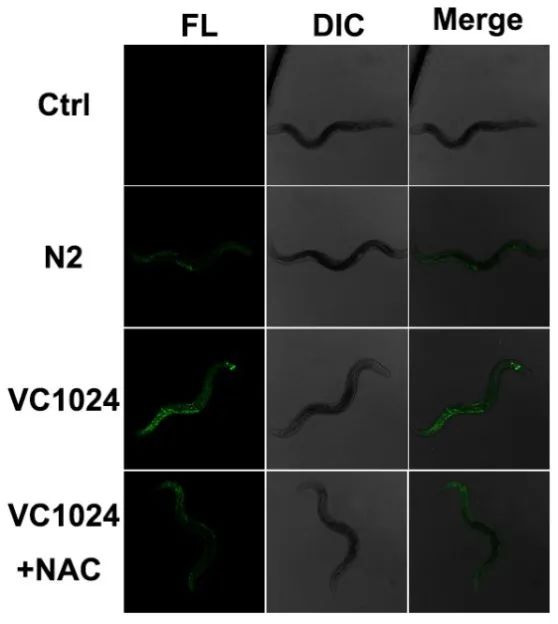 Fig 6. Fluorescence imaging of N2 worms, normal VC1024 worms and VC1024 worms cultured with NAC, then incubated with CBH for 30 min at 37 °C.