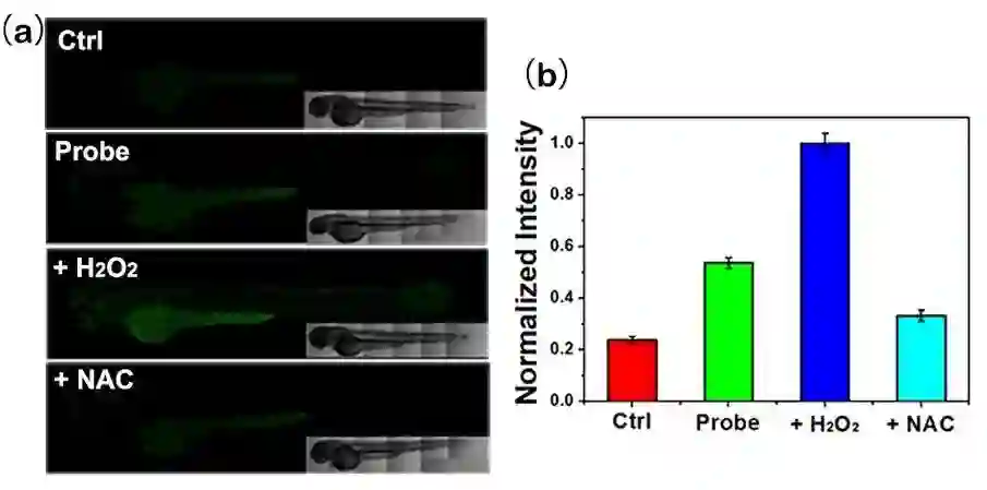 Fig 5. (a) Confocal images of zebrafish (5-day-old) with CBH for 30 min and incubated with H2O2 or pretreated with NAC. (b) Relative fluorescence intensities of imaging.