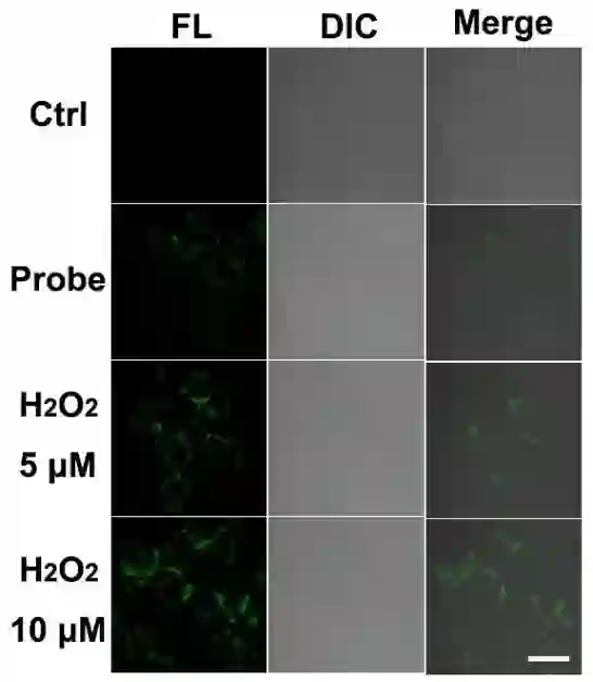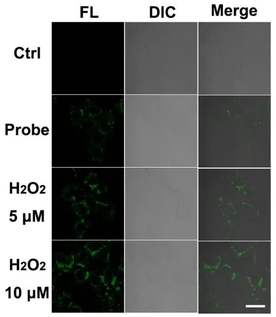Fig 3. Confocal fluorescence microscopy imaging of live HeLa cells pre-treated with CBH and different concentrations of H2O2 for 30 min at 37 °C. Scale bar represents 20 μm.