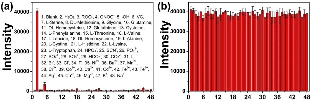 在实际应用中,探针的工作环境复杂,对 H2O2 的响应是否具有专一性和优先性,是否受其他物质的干扰,是考察探针 CBH 性能的关键指标。本文选择 47 种在复杂生物环境中常见的金属离子、阴离子、氨基酸、活性氧(ROS)和 RNS 作为参照,通过选择性和竞争性实验,考察了探针对 H2O2 响应的专一性。实验结果表明,仅在 H2O2 存在的条件下,反应液荧光显著增强,且不受其他物质的干扰,证明探针 CBH 对 H2O2 具有高选择性;而在以上 47 种溶液中加入相同含量的 H2O2 后,反应液荧光均出现明显提高,表明在复杂环境中,探针会优先与 H2O2 反应,排除了其他物质的干扰和竞争,证明探针 CBH 可用于复杂生物环境中 H2O2 的检测。