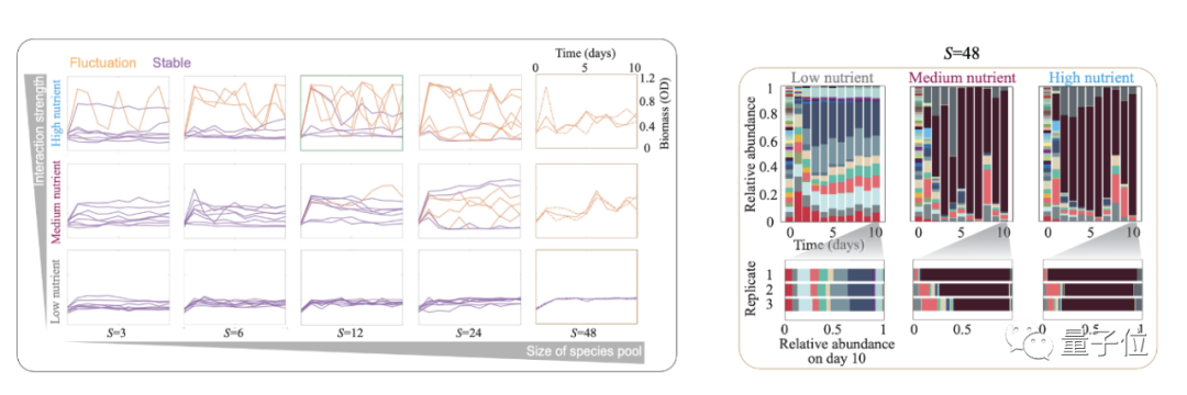 实验结果显示,群落生物量的波动在物种规模或者相互作用强度增加下,也会同样增加。以48个物种群落为例,研究人员发现只有在低营养浓度下才会达到稳定。