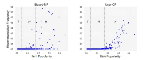 通过分析推荐结果,还有常见的流行度偏差(popularity bias)和不公平(unfairness)现象。