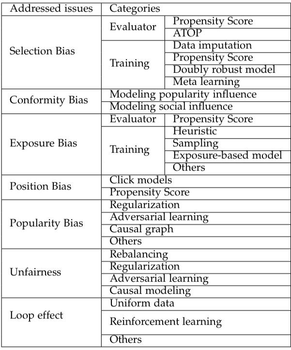 为了减弱 bias 对于推荐结果的影响,很多去偏(debias)的方法被提出来,表 2 总结了各种去偏方法。这里选取几种常用的方法进行简单介绍,对这些技术细节感兴趣的读者可以参考综述原文。
