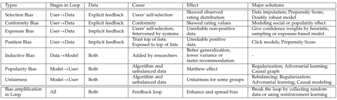 从特征可以将 bias 分成多个类别,大部分 bias 的也都有着共同的起因,即推荐系统中的数据是观测数据而非实验数据,未来有希望构建统一的去偏框架处理全部的 bias。