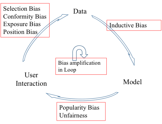 推荐系统构成动态的反馈环路,动态的环路会增加 bias。举个例子,流行的物品在推荐结果中有更高的出现频率、展示给用户后将会有更多关于流行物品的交互、更多的交互将使得模型更容易推荐流行的物品。