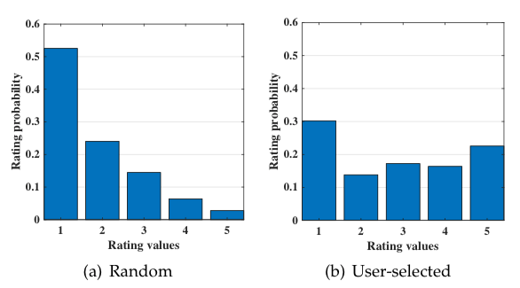 图 3 是用户对于随机物品和自主选择的物品的打分分布,可以明显地看出,两者的分布有较大的差异。当用户拥有自由选择权的时候,更倾向于给自己喜欢的物品打分。