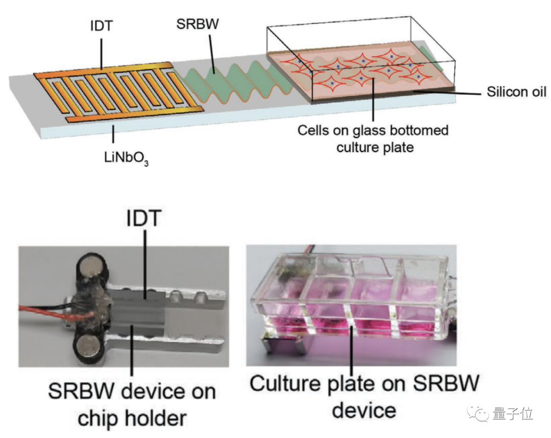 10MHz的高频声波(绿色部分)通过光刻在铌酸锂晶体(LiNbO3)基片上的叉指换能器(IDT)发出,细胞就在玻璃培养皿中薄薄的一层硅油中被促成分化。