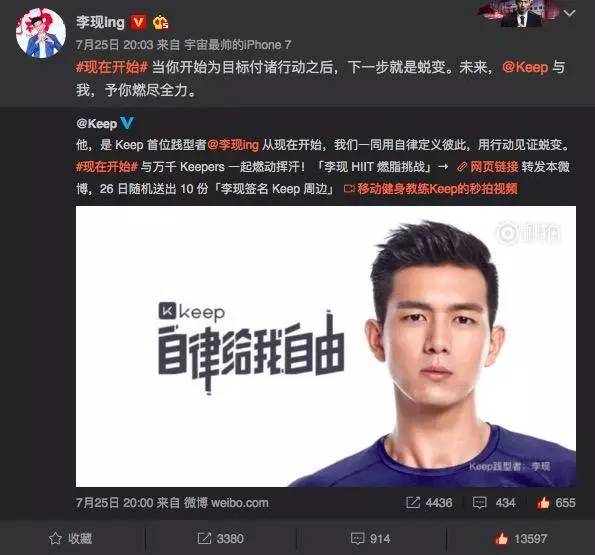 Keep打造这样的品牌活动,就是为了让潜在用户能够感受Keep品牌符号年轻化、积极、健康化的特点,是年轻人喜欢的互联网运动品牌。例如,今年夏季,Keep与明星李现签约,使其成为Keep课程的“践型者”代表,推出“李现HIIT燃脂挑战”健身课程,通过李现青春、活力的形象影响更多人去勇敢追求更好的自己。